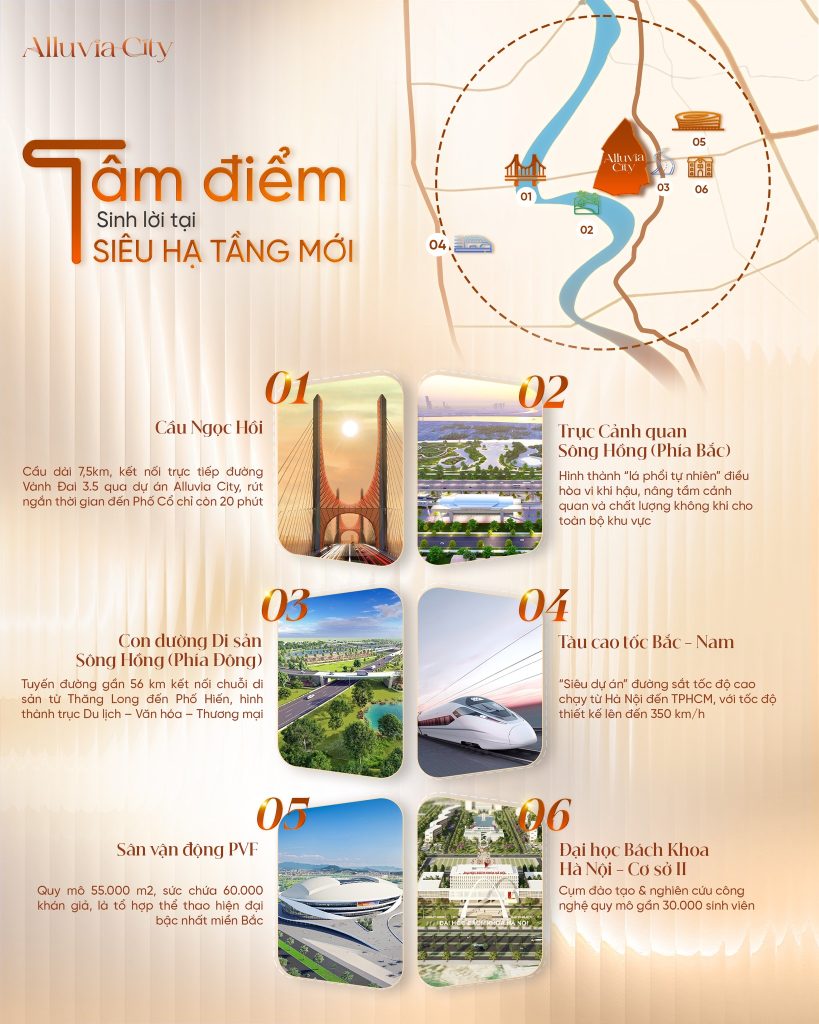 Với lợi thế nằm giữa tâm điểm của 6 siêu hạ tầng chiến lược, Alluvia City không chỉ đón đầu làn sóng phát triển của khu Đông Hà Nội, mà còn sở hữu nền tảng vững chắc cho sự tăng trưởng dài hạn. Mỗi bước tiến của hạ tầng đều tạo ra cú cộng hưởng trực tiếp, gia tăng giá trị sống cho cư dân và mở rộng biên độ sinh lời cho nhà đầu tư.