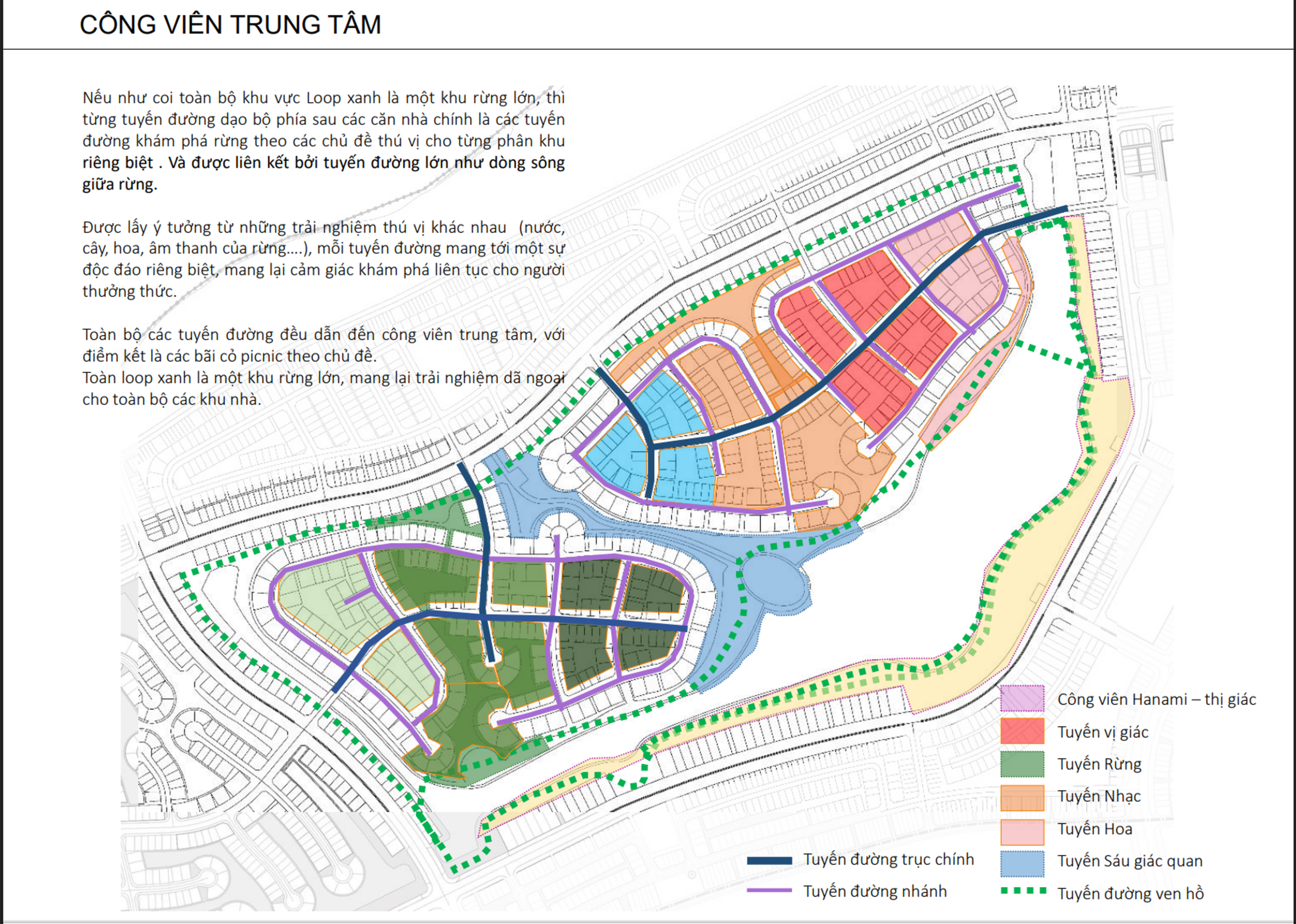 - Tuyến vị giác & Tuyến hoa: nơi cư dân có thể thưởng thức hương thơm, sắc màu và trải nghiệm ẩm thực picnic giữa thiên nhiên.