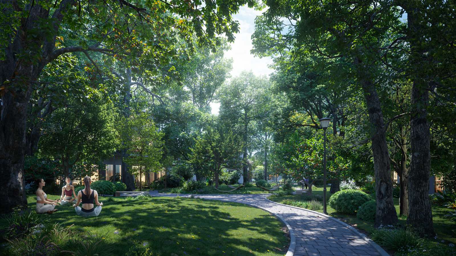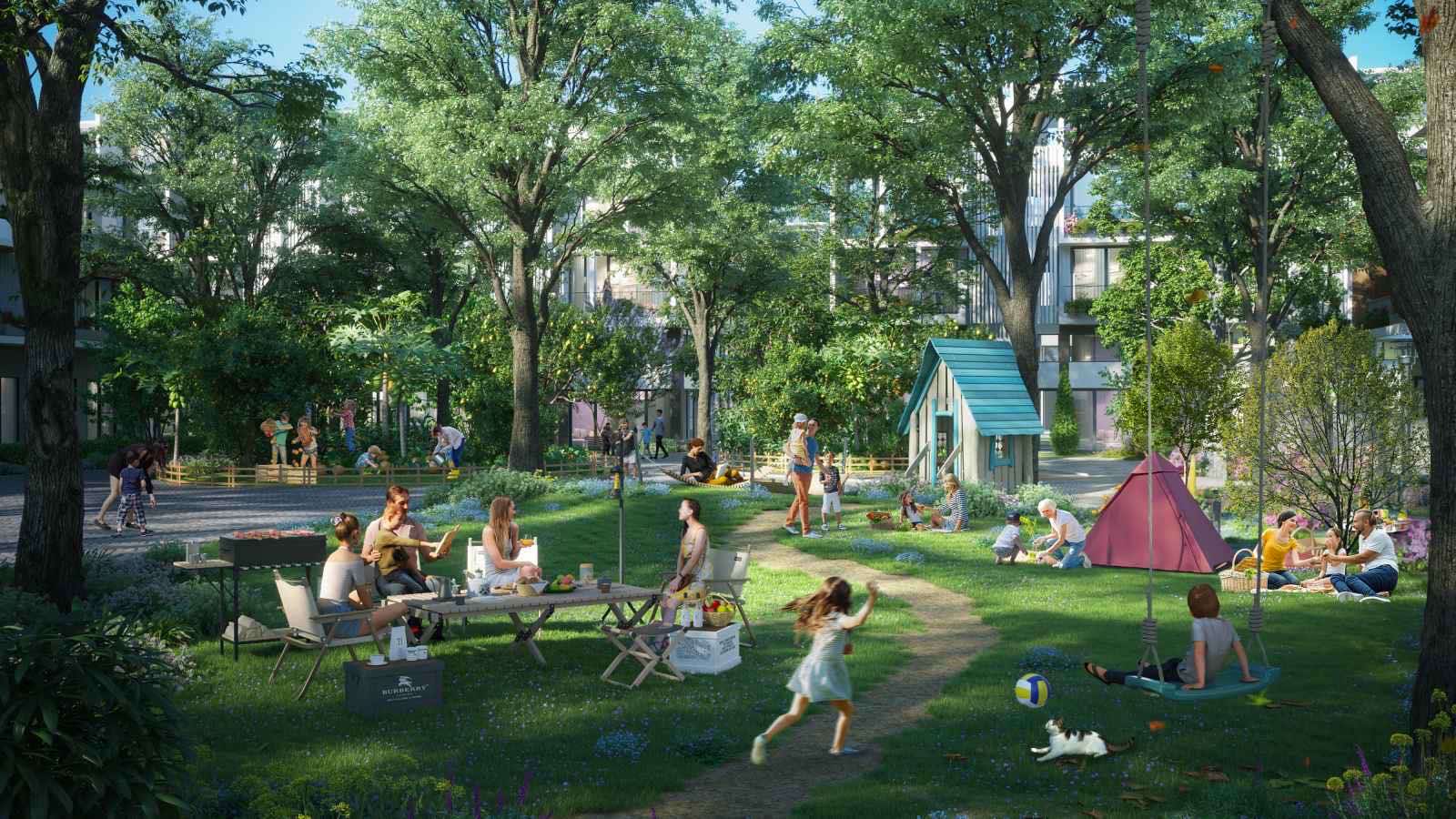 Màu xanh lá là màu đặc trưng của KĐT. Tại đây, mỗi cư dân được “nuông chiều” bằng 125 cây xanh. Cây xanh tạ đây được trồng thành 5 tầng, 5 lớp: cây cổ thụ – cây cao – cây tầm trung – cây bụi – thảm cỏ; ánh nắn mùa hè lọt qua tán cây thành từng tia, rất đẹp vào mùa hạ.